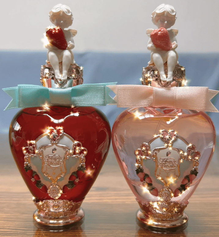 Flower Knows “Strawberry Cupid” Perfume Series is considered one of the best perfume bottle design ideas of 2026 because it fully transforms the concept of a “sweet fairy tale” into a tangible, collectible object. The three-dimensional ceramic Strawberry Cupid cap instantly defines the theme with its delicate craftsmanship and charming silhouette, while the heart-shaped transparent glass bottle and soft pink liquid create a cohesive, dessert-like visual harmony. Lolita-inspired embossed metal emblems and a satin ribbon at the neck enhance the sense of ceremony, making the bottle feel like a beautifully wrapped gift rather than simple packaging.
